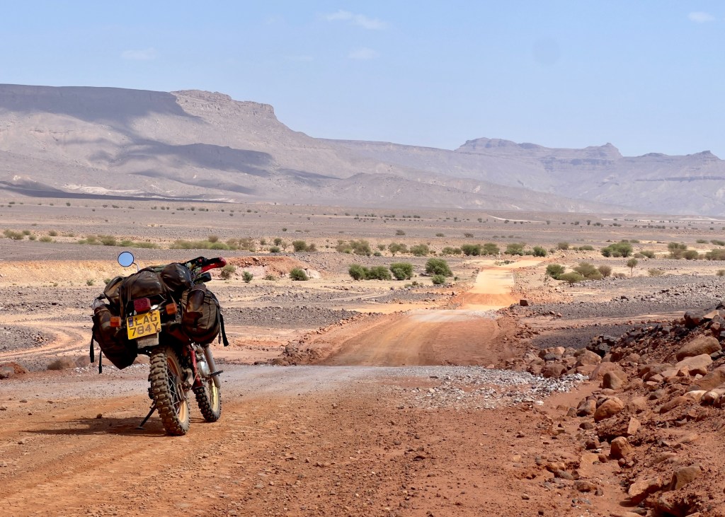 It’s when you turn south that things start to get really interesting, as the track becomes less well travelled. This is the second half of a Sahara Overland routes. You certainly get the sense of remoteness and that no-one has been here for a while. The territory soon becomes rocky and technical in places after crossing over a number of oueds, and whilst the landscape starts out flat, variations between undulations, rocky gullies and valleys soon emerge. The track is also sandy in places, but be careful about going great guns – there are big rocks too, leaving you with the unpalatable choice of getting your speed up and risking hitting something solid or slowing it down to avoid those rocks and paddling through.