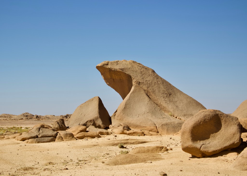 In the second half of the southern part, the track gradually becomes more well-worn, as it threads its way through rock formations and what are marked on the map as rock art sites. There’s a sandy guelta that you’ll need to cross towards the end, but that’s not quite it yet – there’s another rocky pass to climb and then a final descent on some faster sandy tracks, as the view opens out ahead of you, and you’re reunited with the black top beyond.