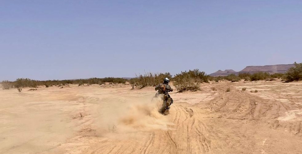Camp El Mharech, located in the gorge at 126km, is the last point of contact. The route exits the gorge, threading across sandy tracks for the next few kilometres. A second dry lake bed is encountered at 130km, but this quickly gives way to a series of small dunes and some slippery sand, potentially including feche feche, demanding sustained momentum.