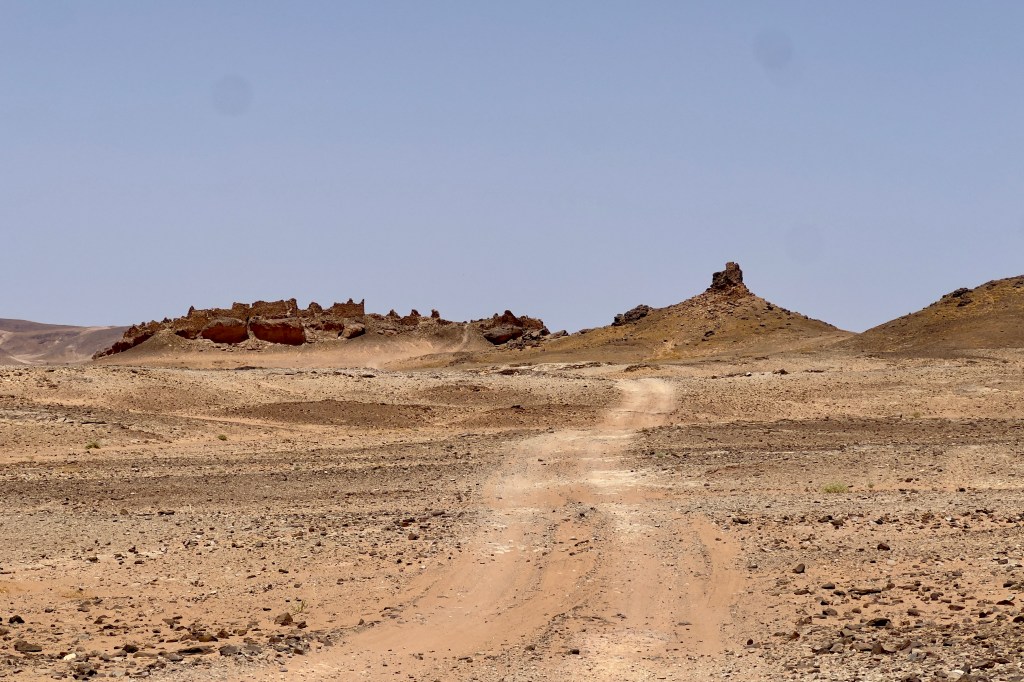 Emerging from the mini-dunes, the track joins a more travelled north-south piste. Just 5km later, at approximately 150km, lies the ruins of the Lost City of Ba Hallou. Sand continues after Ba Hallou, including the difficult crossing of the notorious dried-up Oued Rheris riverbed.