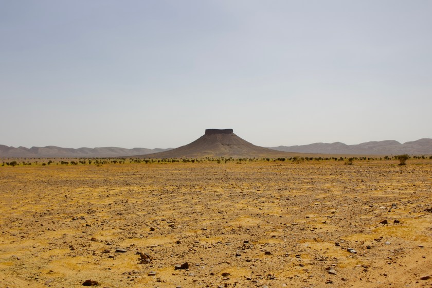 Beyond the Oued Rheris, the terrain gradually becomes easier, winding across flat scrubland of light sand and basalt rock, punctuated by distinctive vertical mesa-like rock formations. The first signs of mobile phone coverage return around 190km, and the challenging off-road section finally ends between 200-210km upon arrival at the main paved road leading north to Merzouga.